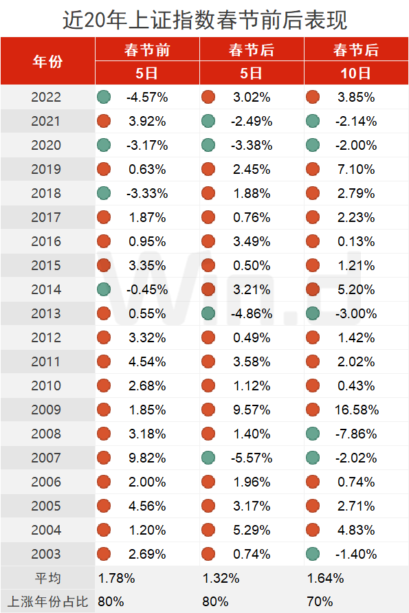 wind统计的近20年春节期间大A涨跌情况,分享一下: