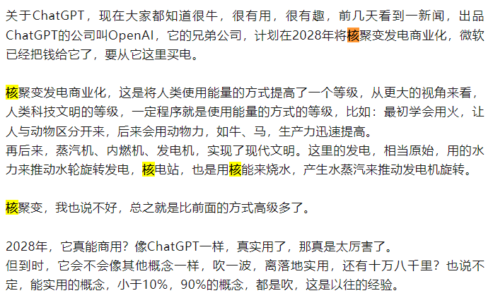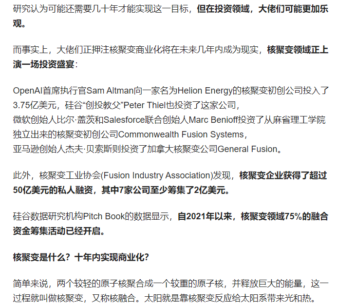 虽然是段子,但也说明了这条路极难走,像5月12日就有这家出品ChatGPT的OPEN AI兄弟公司,表示2028年要将核聚变发电商业化