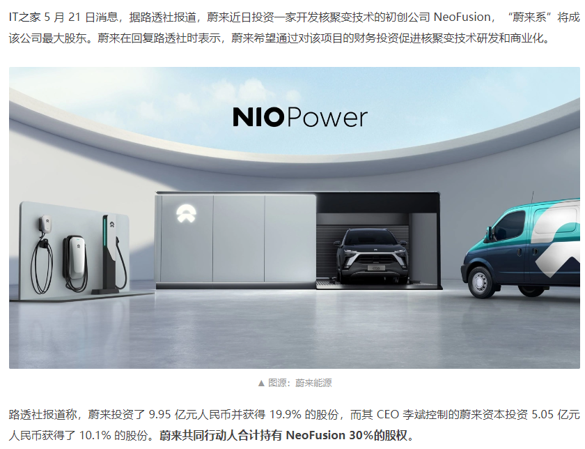 蔚来投资核能初创公司,目标 20 年内商业化核聚变技术