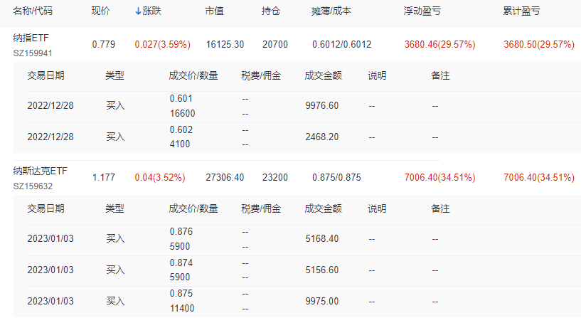 最近很多人说羡慕纳指,其实,我想说,我持仓它有几个月了,2022年12月28日买入过,1月3日买入过,相信看了纳指ETF159941、纳斯达克ETF159632走势的人,应该知道,那时正是阶段低点。