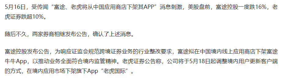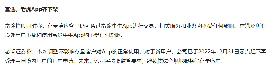 这两家是炒美股、港股等海外的品种的,之前就已经禁止开发新客户了,这次是直接对APP下手了。我以前炒外汇时,用的平台,比这还野,只是我只出小钱,当玩网络游戏一样来玩,也不怕它野,不怕它黑。那些没控制好自己,投大钱,借钱搞的,弄得家破人亡的,也非常多。