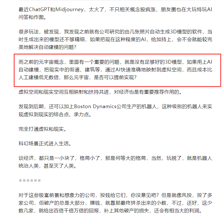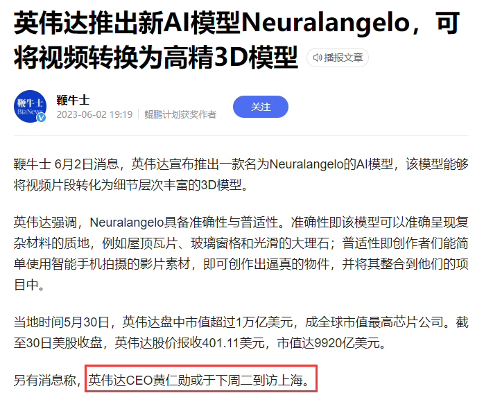 我更看重的是"英伟达推出的新AI模型Neuralangelo AI",看了其宣传视频,太棒了,我于2023-03-25日写的文章《谈钱?格局小了!AI自动建模,元宇宙,机器人,科幻场景进入现实生活》