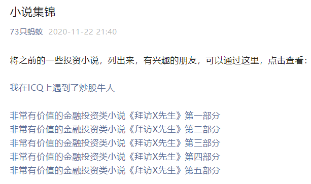 干货,我每天文章末尾都会提到,会找的,已经搜索出来看了,这里我再提一下2020年11月22日,我写的《小说集锦》