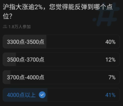 虽然我长期看好A股,也一直接近满仓的持有,但这股民的情绪反转也太厉害了吧,稍微跌几天,就叫着要割肉,要空仓,要骂人;这才一天的2%的上涨,就41%的人,看到四千点以上了。