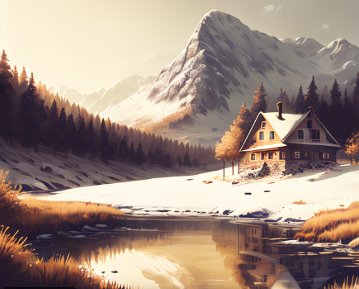 这个配图是用文心一格AI自动生成的,关键词为"山地风景 有漂亮舒适的房子 有水 有雪 温馨 有草地 暖色调"