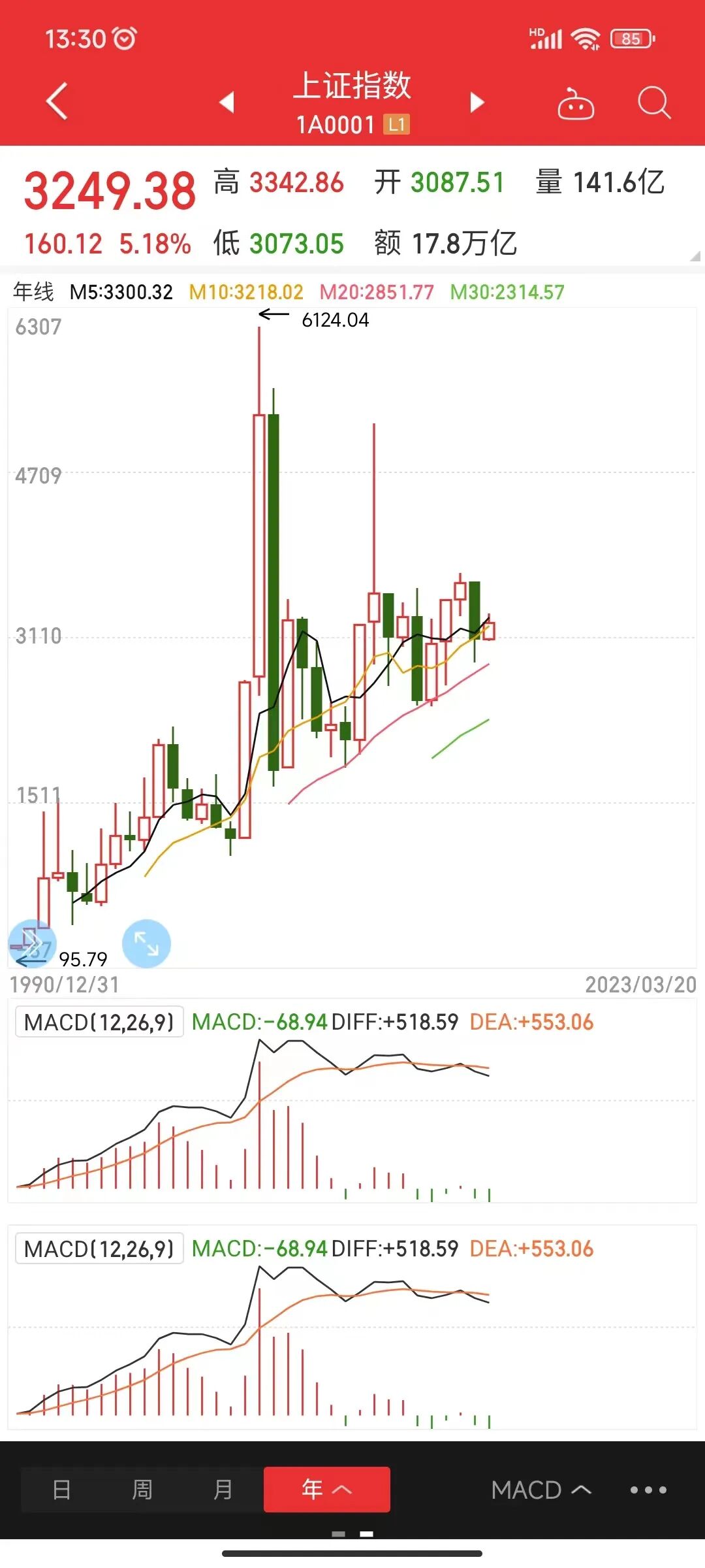 这是上证指数年K线,估计很多人,根本没看过年K线,整天在日K和分时线的跨度上,忙得身心俱疲,还亏钱!