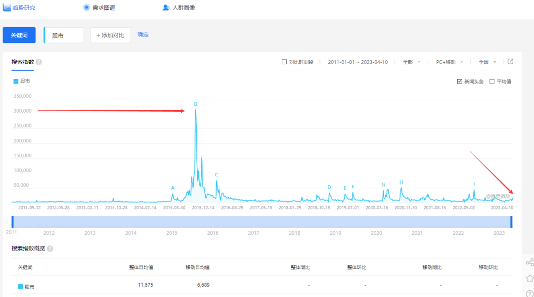 2015年6月,牛市顶点时,搜索指数是30万左右,考虑到现在人们的网络使用量比7年前要高,那么,当这个指数高于30万后,才需要慢慢的开始考虑分批卖出的事。现在,这个指数还是1万1千多,离考虑卖出,还早得很,做长线,就是这么简单且粗暴。