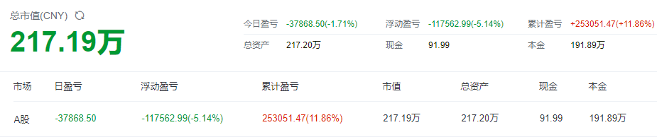 上证指数是几大指数中跌得最少的,也跌了1.91%,我持仓市值跌1.71%,勉强实现比指数少跌的目标。